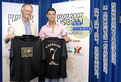 曼联球星C. 罗纳尔多在印有“新七大奇迹”字样的T恤衫上签名,为七大奇迹投票评选活动揭开序幕。他也将出席2007年7月7日在葡萄牙里斯本宣布七大奇迹评选结果的盛大仪式。C. 罗纳尔多说:“我为支持新七大奇迹评选活动而感到骄傲和自豪。这个评选活动让世界各国人民团结在一起,共同庆祝人类共同的文化遗产。把你们对足球的激情也倾注到新七大奇迹上来吧,请为新七大奇迹投票、投票、投票!让我们2007年7月7日里斯本见!”